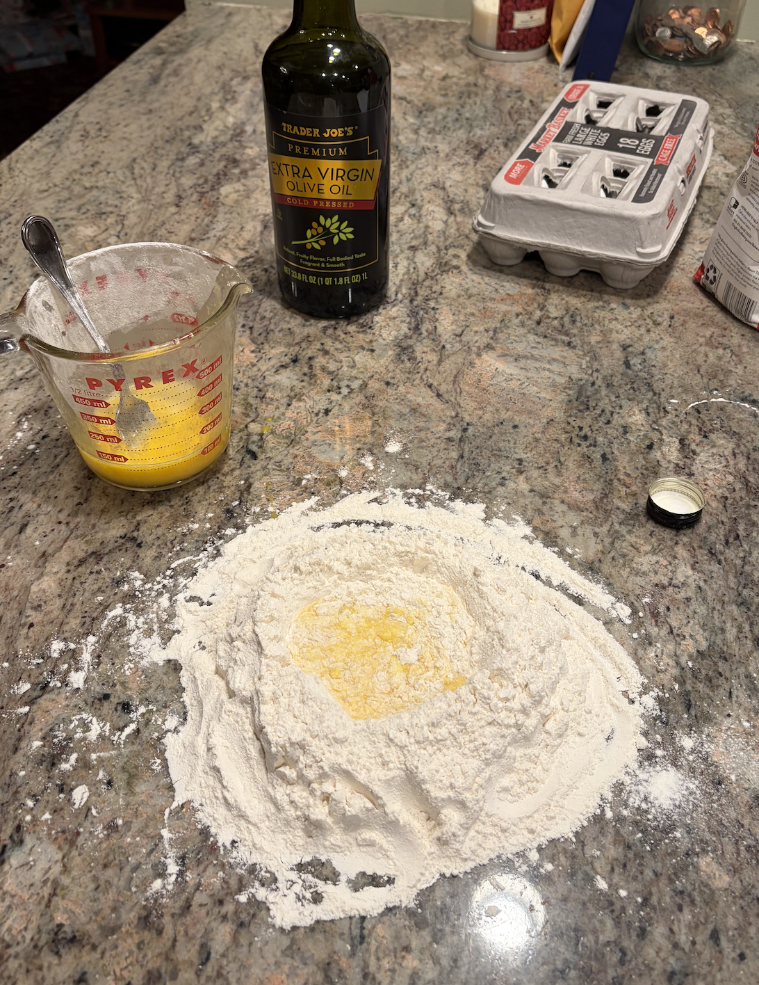 Measure your flour and pour it out on your (cleaned) countertop. Shape the flour with your hands into a “well”. This will be where you place your eggs, yolks and all. You can choose to crack the eggs directly into the well, or whisk separately and pour into the center together. The important thing at this step is to use your hands, or a fork, to slowly mix the flour at the top of the well into the center, slowly combining the wet and the dry into a flaky dough.